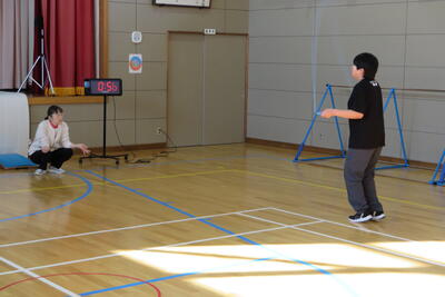 ストップウォッチで時間を計測している最中、できるだけたくさん跳びます。
