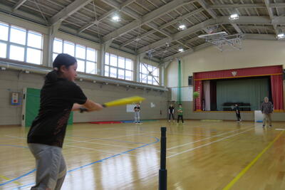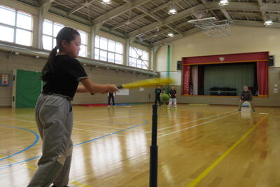 「ベースボール型」のボール運動の学習、少人数でも行えるティーボールを取り組んでいます。