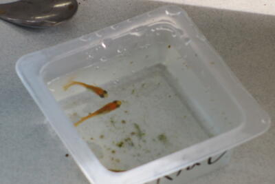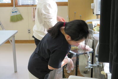 5年生は、教室で飼っているメダカの水槽の水を交換していました。