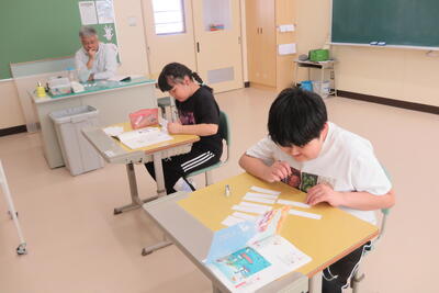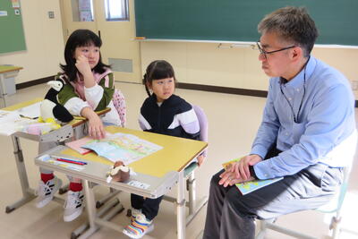 国語の学習を1年生と4年生で一緒にしていました。