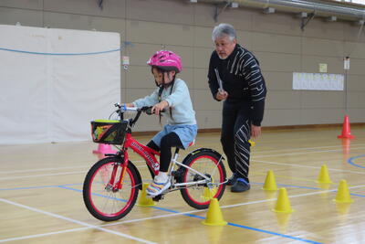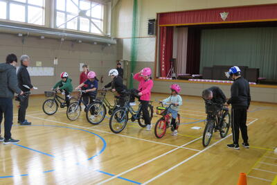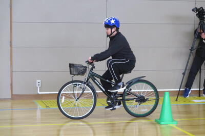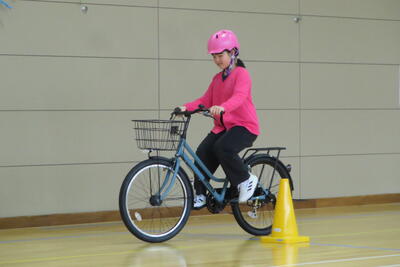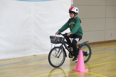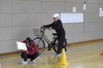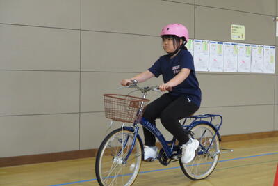 実際の道路で練習する予定でしたが、雨なので体育館で走行練習です。